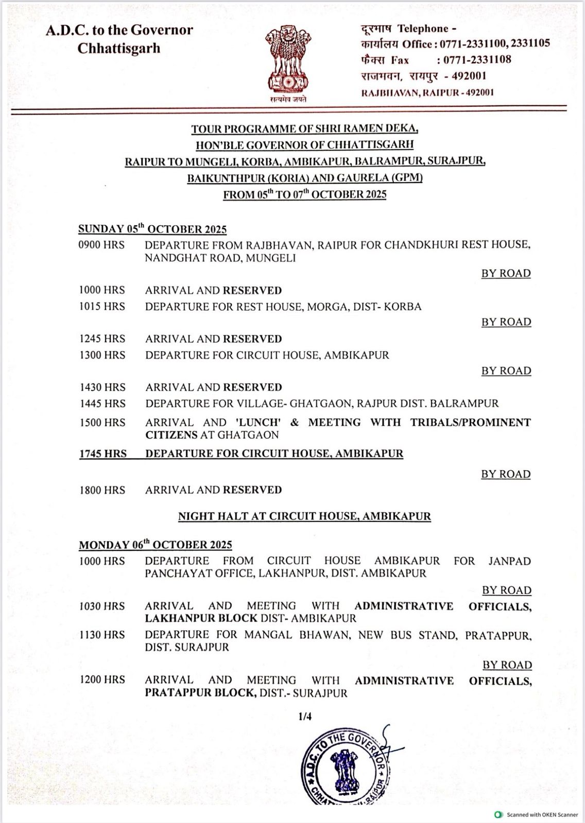 राज्यपाल रमेन डेका का सरगुजा संभाग का दौरा कल से शुरू, दो दिन में छह ज़िलों का निरीक्षण कार्यक्रम।