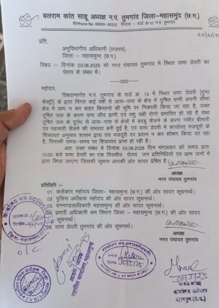 आपका आदेश न्यूज़।। महासमुंद 3 जून 2025 / तुमगांव में संचालित वामा डेयरी (दूध फैक्ट्री) से तंग आकर अनुविभागीय अधिकारी (राजस्व ) महासमुंद को ज्ञापन सौंपते हुए नगर पंचायत