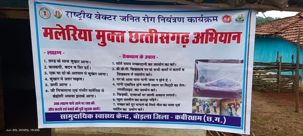आपका आदेश न्यूज़।। कवर्धा, 26 जून 2025। जिले को मलेरिया से पूर्णतः मुक्त करने के संकल्प के साथ मलेरिया मुक्त छत्तीसगढ़ अभियान का बारहवां चरण कबीरधाम जिले में 25 जून से प्रारंभ हो गया है। यह चरण आगामी 24 जुलाई 2025 तक जिले के चिन्हित अति संवेदनशील, दुर्गम और मलेरिया प्रभावित ग्रामों में संचालित किया जा रहा है।