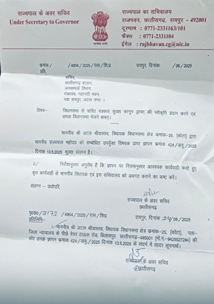 “राज्यपाल ने पत्रकार सुरक्षा कानून पर छत्तीसगढ़ शासन को लिखा पत्र, विधायक अटल श्रीवास्तव के आग्रह पर की कार्रवाई”
