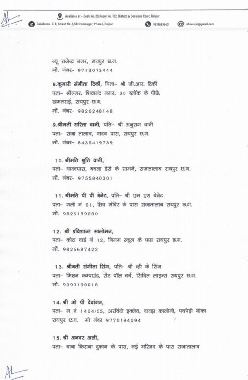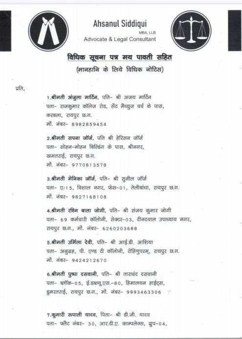 आपका आदेश न्यूज़ छत्तीसगढ़।। रायपुर, 4 जुलाई 2025। रायपुर शहर के एक प्रतिष्ठित निजी विद्यालय की प्रभारी प्राचार्य श्रीमती रुपिका लॉरेंस ने स्कूल प्रबंधन और कार्यप्रणाली पर झूठे और मानहानिक आरोप लगाने वाले 15 व्यक्तियों को कानूनी नोटिस जारी किया है। यह नोटिस रायपुर जिला न्यायालय के अधिवक्ता अहसानुल सिद्दीकी द्वारा दिनांक 4 जुलाई 2025 को भेजा गया।