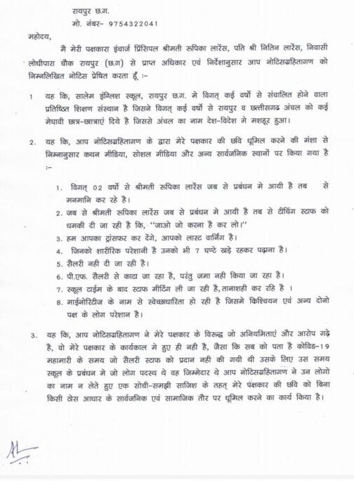 नोटिस में बताया गया है कि श्रीमती रुपिका लॉरेंस विगत 20 वर्षों से शिक्षा सेवा में कार्यरत हैं और पिछले कुछ वर्षों से विद्यालय की प्रभारी प्राचार्य के रूप में कर्तव्य निभा रही हैं। किंतु हाल ही में एक समूह द्वारा उनके विरुद्ध सोशल मीडिया, शासकीय संस्थानों और अभिभावकों के बीच झूठे, अपमानजनक और दुर्भावनापूर्ण आरोप फैलाए गए हैं, जिनका कोई कानूनी या तथ्यात्मक आधार नहीं है।