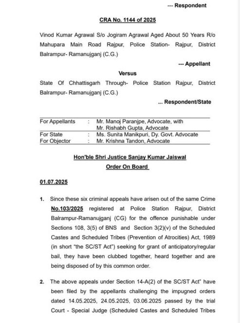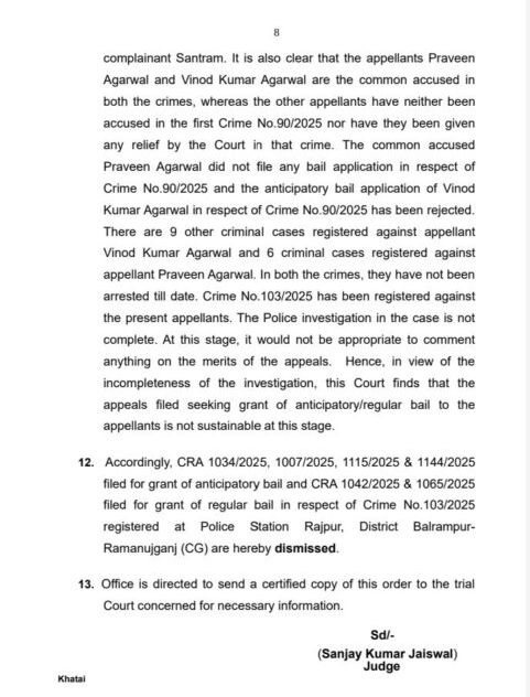 1 जुलाई 2025 को, छत्तीसगढ़ हाईकोर्ट ने विनोद अग्रवाल सहित छह आरोपियों की ज़मानत याचिकाएँ खारिज कर दीं। जज संजय कुमार जायसवाल की बेंच ने कहा —