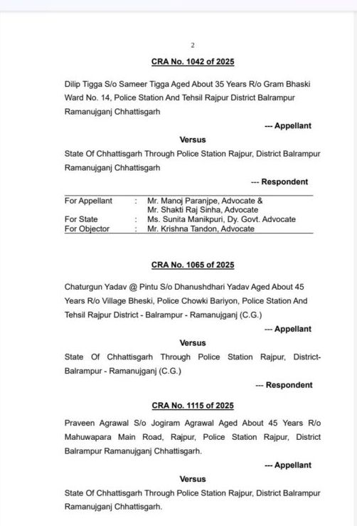 उच्च न्यायालय ने सभी याचिकाएँ अस्वीकार करते हुए ट्रायल कोर्ट को आदेश की प्रति शीघ्र भेजने का निर्देश दिया है। यह समाचार न्यायिक आदेश (CRA No. 1034/2025 & Others) पर आधारित है।