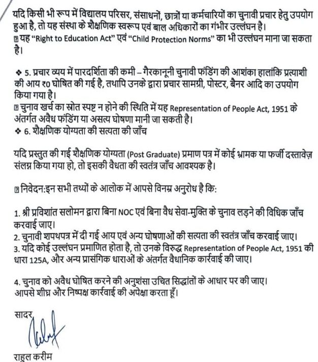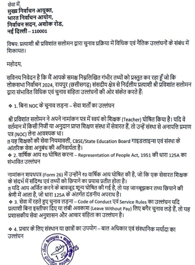 रायपुर 21 जुलाई 2025 _ छत्तीसगढ़ लोकसभा क्षेत्र से निर्दलीय प्रत्याशी श्री प्रविशांत सलोमन द्वारा चुनाव प्रक्रिया में की गई गंभीर कानूनी और नैतिक अनियमितताओं के संबंध में आज एक विस्तृत शिकायत पत्र भारत निर्वाचन आयोग, नई दिल्ली को प्रेषित किया गया है। शिकायतकर्ता श्री राहुल करीम, वरिष्ठ समाजसेवी और जागरूक मतदाता ने निर्वाचन आयोग से तत्काल संज्ञान लेकर विधिक कार्यवाही की माँग की है।