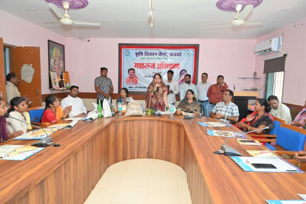कवर्धा 06 अगस्त 2025। कृषि विज्ञान केन्द्र, कवर्धा में 06 अगस्त 2025 को मशरूम उत्पादन विषय पर एक दिवसीय प्रशिक्षण आयोजित किया गया एवं प्रशिक्षणार्थियों को प्रमाण पत्र वितरित किया गया। इस कार्यक्रम के मुख्य अतिथि पूर्व जिला पंचायत सदस्य श्रीमती रश्मि विजय शर्मा शामिल हुए। कृषि विज्ञान केन्द्र, कवर्धा द्वारा कौशल भारत एवं ग्रामीण युवाओं के लिए कौशल प्रशिक्षण अंतर्गत जिले के 106 महिला प्रतिभागियों को मशरूम उत्पादन एवं माली प्रशिक्षण प्रदाय किया गया। सफल प्रशिक्षणार्थियों को पूर्व जिला पंचायत सदस्य श्रीमती रश्मि विजय शर्मा के द्वारा प्रमाण पत्र का वितरण किया गया तथा कृषि विज्ञान केन्द्र द्वारा फलो एवं सब्जियों के आचार बनाने की विधि पर प्रकाशित पाम्पलेट कर विमोचन किया गया। कृषि विज्ञान केन्द्र, कवर्धा के वरिष्ठ वैज्ञानिक एवं प्रमुख, डॉ. बी.पी. त्रिपाठी ने कृषि विज्ञान केन्द्र की गतिविधियों की जानकारी दी। इस अवसर पर श्रीमती सविता ठाकुर, श्रीमती निशा साहु,कृषि विज्ञान केन्द्र, कवर्धा के वैज्ञानिक इंजी. टी. एस. सोनवानी, डॉ. बी. एस. परिहार एवं डॉ. एन.सी. बंजारा एवं अन्य अधिकारी, कर्मचारी जनप्रतिनिधि, ग्रामीण उपस्थित थे।