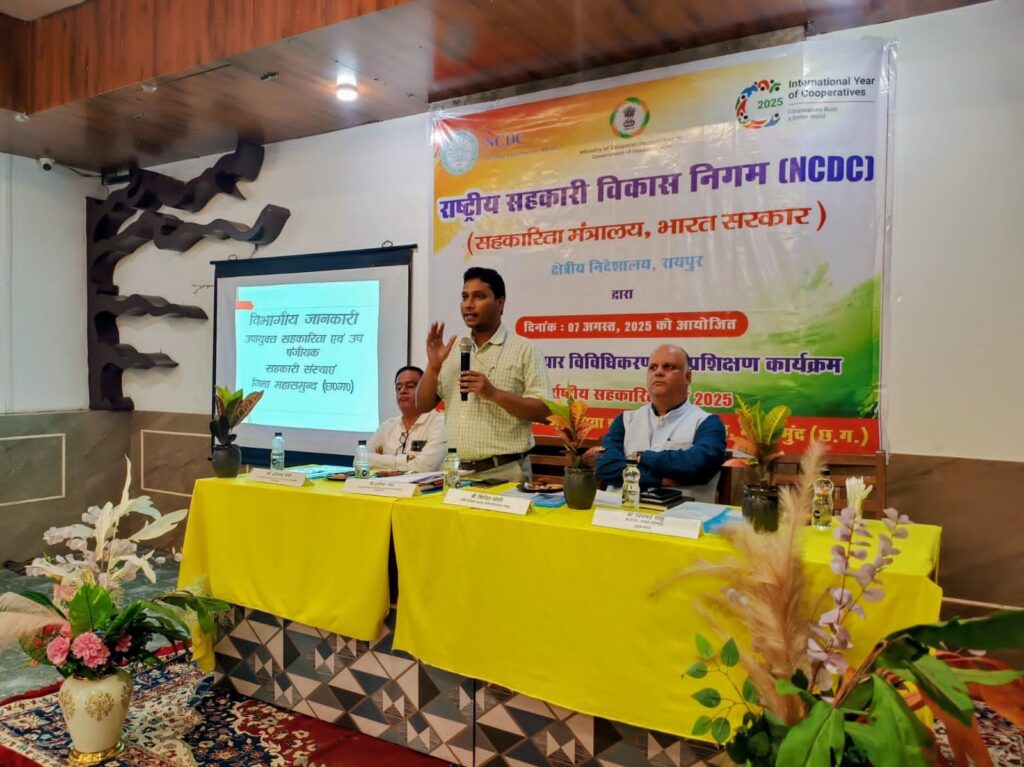 महासमुंद _दिनांक 07 अगस्त, 2025 राष्ट्रीय सहकारी विकास निगम, सहकारिता मंत्रालय, भारत सरकार द्वारा जिला महासमुंद में “एम-पैक्स के व्यापार विविधिकरण” विषय पर एक दिवसीय भौतिक प्रशिक्षण कार्यक्रम का आयोजन सभागार, होटल आकासिया, जिला महासमुंद में किया गया ।