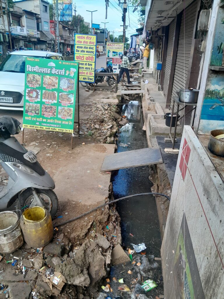 रायपुर _ रायपुर मोतिबाग़ से एवरग्रीन चौँक शहर का मुख्य सड़क है जहाँ पर नाली निर्माण का कार्य पिछले दो महीनों से अधूरा पड़ा है। ठेकेदार द्वारा सड़क खोदने के बाद कार्य बंद कर देने से स्थानीय निवासियों को, व्यापारियों को गंभीर समस्याओं का सामना करना पड़ रहा है।