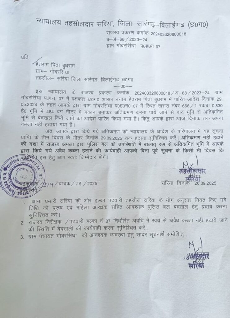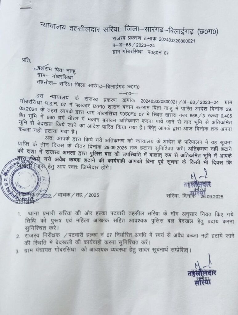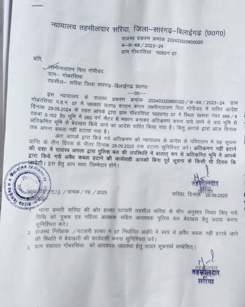 सूत्रों से मिली जानकारी अनुसार सारंगढ़-बिलाईगढ़ जिला अंतर्गत बरमकेला ब्लॉक की ग्राम पंचायत गोबरसिंघा में पिछले कुछ वर्षों से शासकीय भूमि पर अवैध कब्जा और खरीद-बिक्री का सिलसिला चल रहा था। ग्रामीणों और सामाजिक कार्यकर्ताओं द्वारा लगातार इस विषय को उठाए जाने के बाद अब प्रशासन ने सख्त रुख अपनाया है। दिनांक 26 सितंबर 2025 को तहसीलदार सरिया के नेतृत्व में प्रशासनिक टीम ने मौके पर पहुंचकर अतिक्रमणकारियों को तीन दिवस के भीतर शासकीय भूमि खाली करने का अंतिम नोटिस जारी कर दिया है।