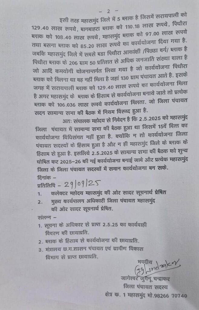 चन्द्राकर ने यह भी कहा कि 2 मई 2025 को हुई जिला पंचायत की सामान्य सभा की बैठक में न तो सदस्यों के हिसाब से और न ही ब्लॉकों के हिसाब से कार्ययोजना बनाई गई। इस वजह से बैठक का निर्णय अधूरा रह गया और कार्ययोजना विकास के बजाय भेदभाव का साधन बनकर रह गई।