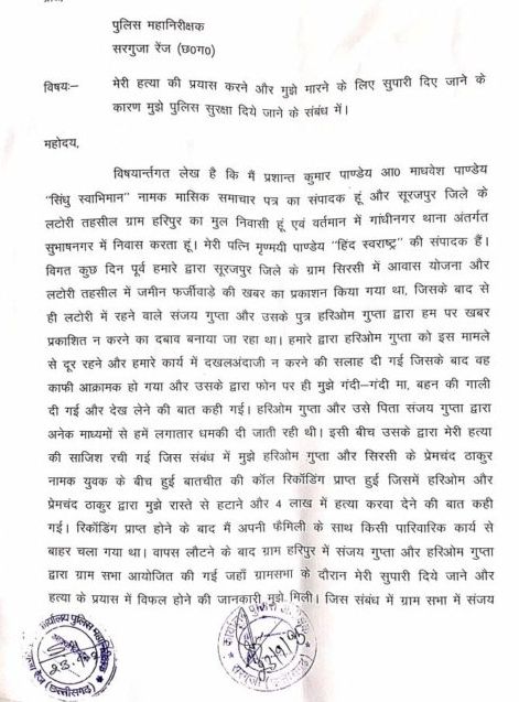 आईजी सरगुजा रेंज से शिकायत — सुरक्षा की मांग
