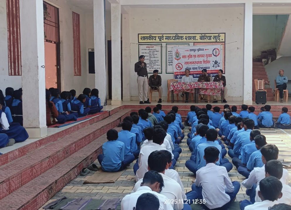 रायपुर छत्तीसगढ़ :_ थाना टिकरापारा की टीम नें कल जनहित को ध्यान में रखते हुए बोरिया खुर्द हाई स्कूल हनुमान नगर में नशा मुक्त भारत अभियान अंतर्गत शपथ एवं जागरूकता कार्यक्रम आयोजित किया गया।