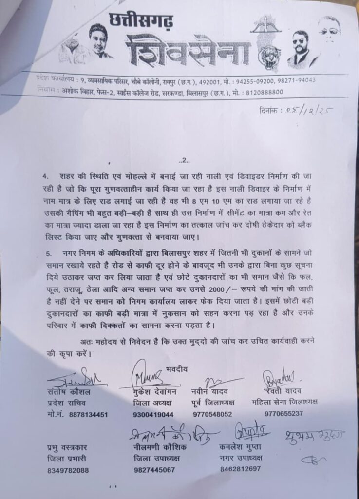 बिलासपुर छत्तीसगढ़ :–शिवसेना के जिला प्रमुख मुकेश देवांगन के नेतृत्व में शिवसेना के प्रतिनिधि मंडल द्वारा जिलाधीश महोदय से मिलकर शहर के जनहित के मुद्दों पर ज्ञापन दिया गया । जिसमें मुख्य रूप से निम्नलिखित मांगे रखी गई है।