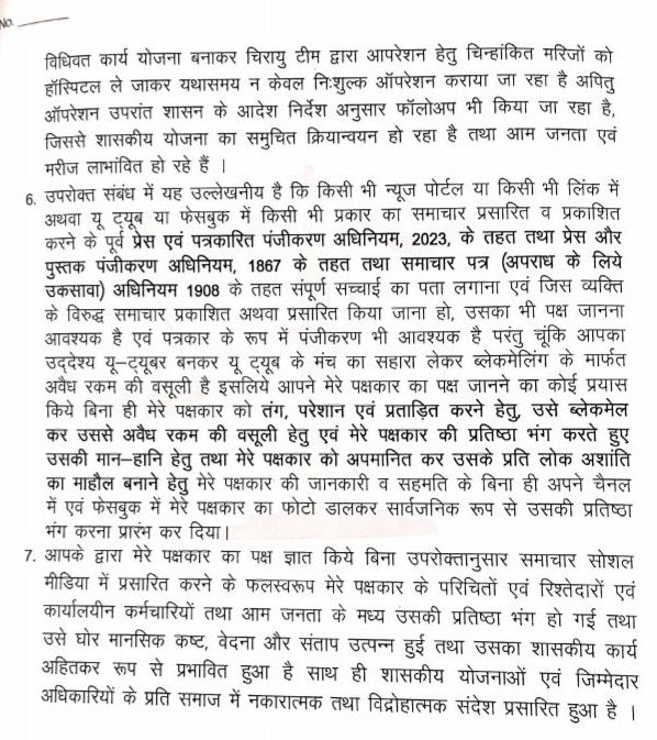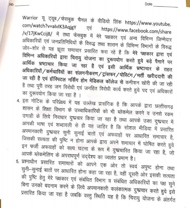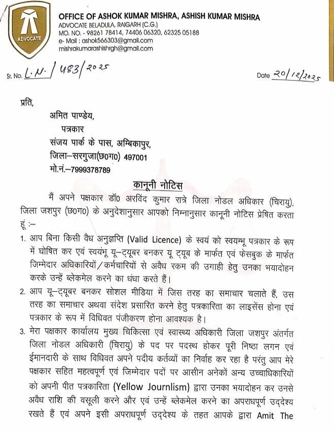 सूत्र के अनुसार आजकल जशपुर के स्वास्थ्य विभाग में ‘चिरायु’ (Chirayu) योजना से ज्यादा चर्चा ‘मानहानि’ (Defamation) की हो रही है। यहाँ के नोडल अधिकारी डॉ. अरविंद कुमार रात्रे को शायद लगा कि वह अस्पताल में ‘मरीज’ देख रहे हैं, इसलिए उन्होंने अंबिकापुर के पत्रकार अमित पांडेय के सवाल पूछने पर उन्हें ₹50 लाख के मुआवजे वाला ‘कानूनी प्रिस्क्रिप्शन’ (नोटिस) थमा दिया।