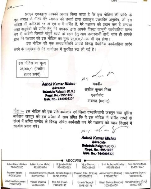 जशपुरिया ‘रात्रे’ का ‘अंधेरे’ में तीर: – पत्रकार को ₹ 50 लाख का नोटिस।