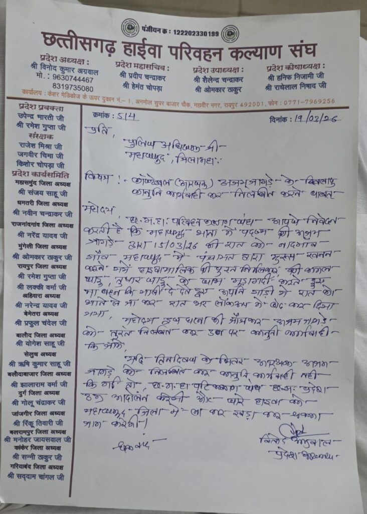 महासमुंद। जिले में ट्रांसपोर्टरों के साथ दबंगई, मारपीट और अवैध वसूली का सनसनीखेज मामला सामने आया है। छत्तीसगढ़ हाइवा परिवहन कल्याण संघ ने इस पूरे मामले को लेकर पुलिस अधीक्षक को लिखित शिकायत सौंपते हुए एक पुलिस आरक्षक और उसके भाई के खिलाफ कड़ी कार्रवाई की मांग की है।
