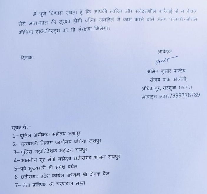 मामला यह है कि जिले के एक सक्रिय पत्रकार एवं सोशल मीडिया इंफ्लुएंसर अमित कुमार पाण्डेय ने अपनी जान को खतरा बताते हुए पुलिस प्रशासन से तत्काल सुरक्षा की मांग की है। उन्होंने इस संबंध में पुलिस महानिरीक्षक, सरगुजा रेंज अंबिकापुर को एक लिखित आवेदन सौंपा है, जिसमें गंभीर आरोप लगाए गए हैं।