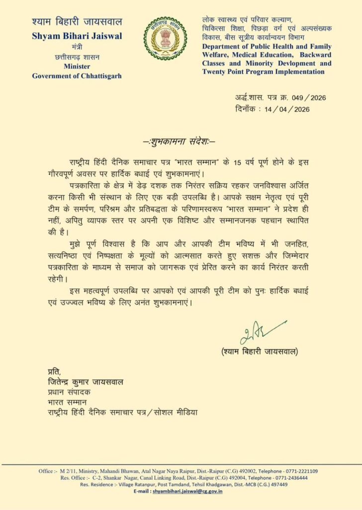 राष्ट्रीय हिंदी दैनिक समाचार पत्र भारत सम्मान ने अपने सफल प्रकाशन के 15 वर्ष पूर्ण कर लिए हैं।