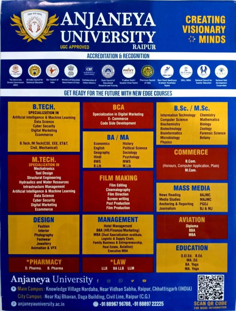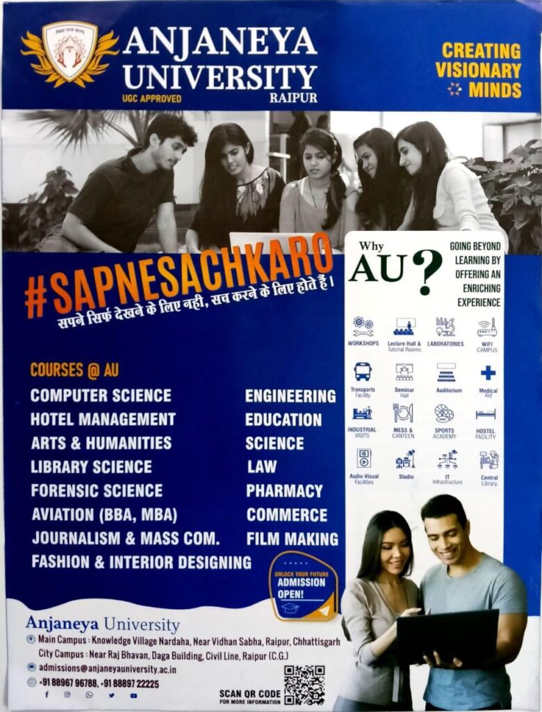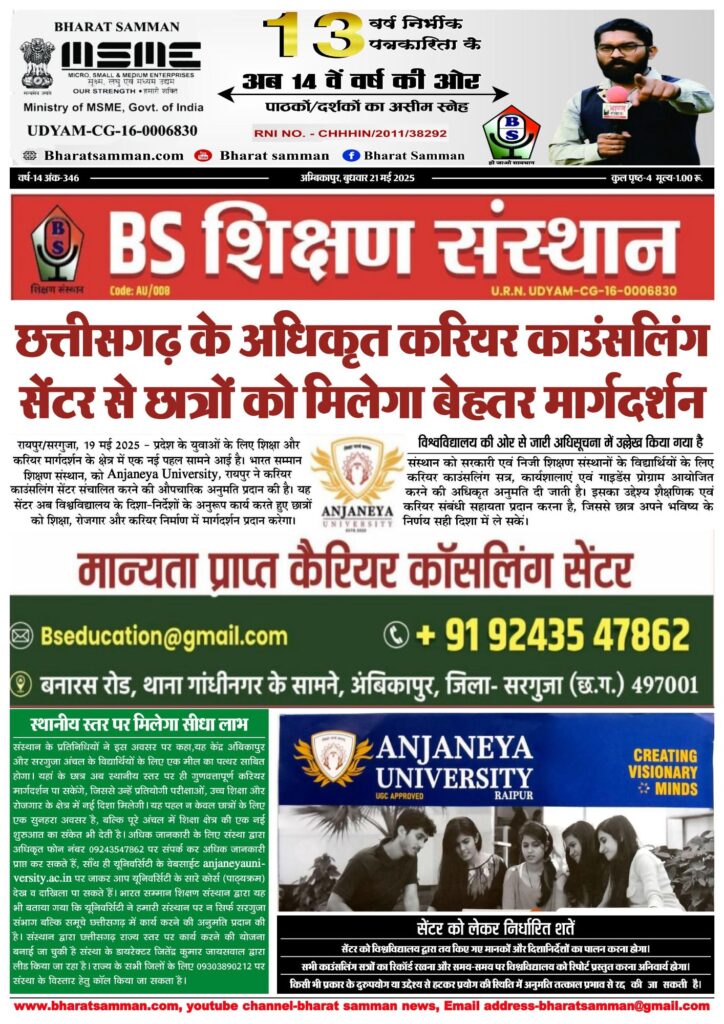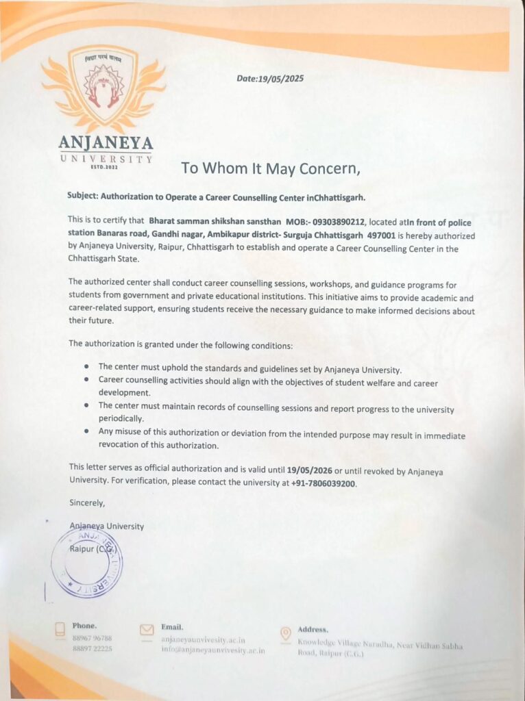 आपका आदेश न्यूज़ //रायपुर/सरगुजा // प्रदेश के युवाओं के लिए शिक्षा और करियर मार्गदर्शन के क्षेत्र में एक नई पहल सामने आई है। भारत सम्मान शिक्षण संस्थान, को Anjaneya University, रायपुर ने करियर काउंसलिंग सेंटर संचालित करने की औपचारिक अनुमति प्रदान की है। यह सेंटर अब विश्वविद्यालय के दिशा-निर्देशों के अनुरूप कार्य करते हुए छात्रों को शिक्षा, रोजगार और करियर निर्माण में मार्गदर्शन प्रदान करेगा।