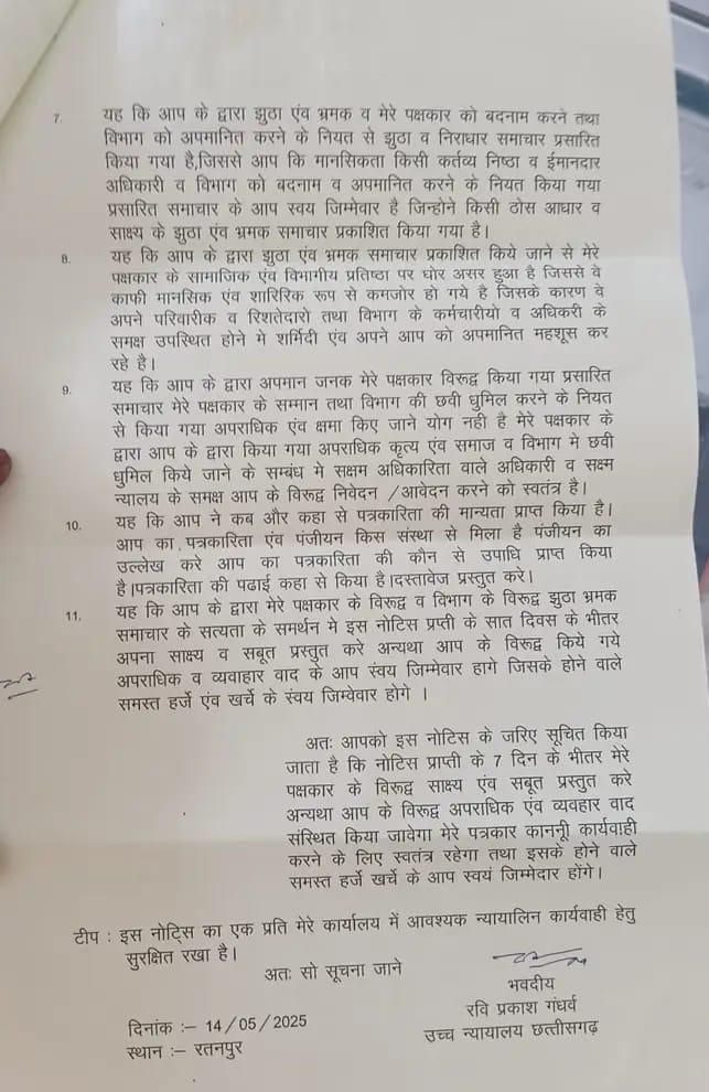 नोटिस में कहा गया है कि प्रकाशित खबर से अधिकारी को “मानसिक, सामाजिक और पारिवारिक क्षति” पहुँची है। साथ ही पत्रकार से 7 दिनों के भीतर जवाब देने, सबूत पेश करने और अपनी शैक्षणिक व पेशेवर योग्यताओं का विवरण मांगा गया है।